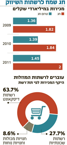 המכירות ברשתות השיווק בשבועיים שלפני ערב החג הגיעו ל־2 מיליארד שקל, זאת לעומת המכירות בערב החג בשנת 2010. הקטגוריות שהובילו את הצמיחה - מזון ומשקאות. הספקים: שופרסל הגדילה בחג את נתח השוק שלה