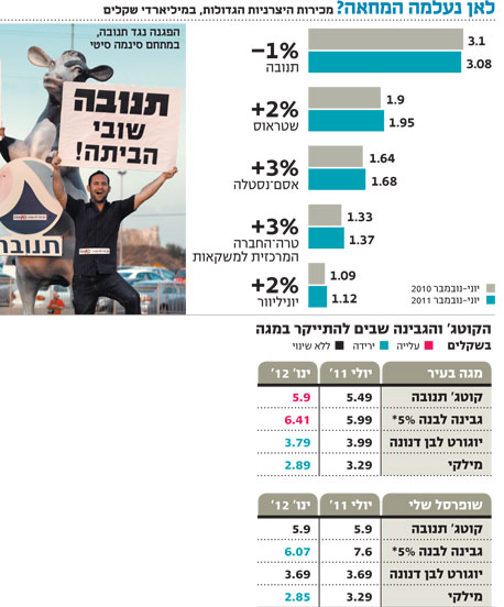 קטגוריית הקוטג' רשמה בתקופת המחאה מכירות של 230 מיליון שקל, ירידה של 20% לעומת התקופה המקבילה בשנת 2010. גם בקטגוריית היוגורט עם פרי חלה צניחה של 14% והיא רשמה מכירות של 207 מיליון שקל, בעוד שמכירות היוגורט הלבן ירדו ב־7% ל־191 מיליון שקל.