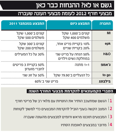 גם חן אשד, סמנכ"ל השיווק ברשת H&O, אומר כי השנה החברות מציעות יותר מבצעים כדי למשוך קונים. הרשת יצאה בשבועות האחרונים עם מבצעים של 30% הנחה על מחלקת הילדים והגברים שהעלו את המכירות, והיום ניתן למצוא בה מבצע של 50% הנחה על הפריט השני. "אין חורף, והמכירות בכלל ענף האופנה בשלושת השבועות האחרונים, נמוכות מהציפיות", מסביר אשד את המצב בענף. "לכולם קשה, אז כולם יצאו במבצעים נקודתיים כדי למשוך את הלקוחות. הצרכן רוצה מבצעים ומזג האוויר לא לטובתנו". לדברי אשד, "אנחנו בתוך מיתון והענף השנה סובל מקשיים עוד יותר משנה שעברה בגלל ההאטה. היום לקוחות מחפשים הזדמנויות, הם לא נכנסים וקונים. הם מחפשים מבצעים. המצב הזה התחיל מענף המזון במחאה בשנה שעברה וחלחל לתחומים נוספים כמו תחום האופנה ותחום מוצרי החשמל. אין שפע כלכלי ויש אווירה של מיתון".
