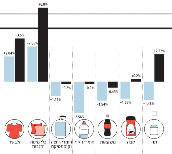 גם מחירי קטגוריות הגלידות והמשקאות הקלים התנהגו השנה באופן שנוגד את המקובל בעשור האחרון. כך, מחיר קטגוריית הגלידה נותרה השנה ללא שינוי לעומת ירידה ממוצעת של 3% בתקופות חגי הפסח של העשור החולף. מחיר סעיף המשקאות הקלים ירד השנה ב־0.5% בלבד לעומת ירידה ממוצעת של 2% בשנים 2019-2010. גם סעיף צורכי משק בית אחרים במדד, הכולל מוצרים כגפרורים וסמרטוטים, עלה השנה בעשירית האחור לאחר שבשנים הקודמות ירד בממוצע ב־1.5% בהשוואה לחודשים שקדמו לתקופת הפסח.