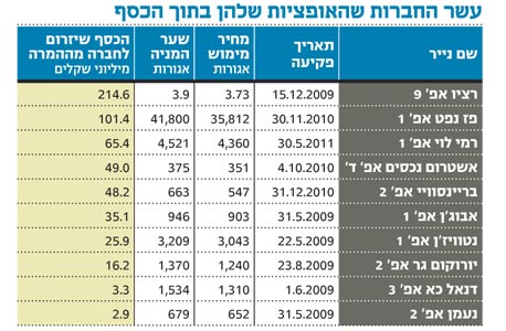 מבדיקת "כלכליסט" עולה כי מתוך 171 הסדרות של כתבי האופציות, 161 (94%) נמצאות מחוץ לכסף (מחיר מימוש האופציה גבוה ממחיר המניה - ראו מסגרת). אילו היו כתבי האופציות נמצאים בכסף ומומרים למניות, היו מנהלי החברות נהנים מהזרמת הון בהיקף כולל של 5.2 מיליארד שקל שהיו יכולות להקל במעט על הקושי בהשגת מימון בתקופה הנוכחית.