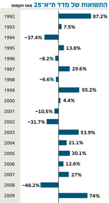 מדד ת"א 25 עושה היסטוריה. בסיום המסחר היום (ה') רושם המדד את התשואה השנתית הגבוהה ביותר שלו מאז שנת הקמתו - 1992. בסיום יום המסחר האחרון של שנת 2009 מסכם המדד תשואה חלומית של כ-74%. השנה היחידה בה נרשמה במדד תשואה גבוהה יותר היא 1992, אז עלה ת"א 25 ב-87.2%.