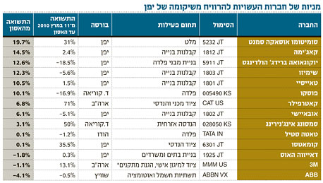 "עד אסון הצונאמי מגזר הבנייה ביפן סבל משיעורי צמיחה נמוכים ומצפי דל בכל הקשור למספר התחלות הבנייה", כך אומר אופיר נבות, מנהל השקעות חו"ל בבית ההשקעות אקסלנס. כל זה השתנה כעת, לנוכח מאמצי השיקום שיחייבו להגדיל את היקפי הבנייה ואת השירותים ההנדסיים הנלווים. בהקשר זה, נבות נזכר בנקודת המפנה שחולל האסון היפני הקודם בעיר קובה: "בראייה היסטורית, אותה רעידת אדמה עוררה ביקושים יציבים ומתמשכים למניות של חברות בנייה". עם זאת, נבות אינו ממהר להמליץ על השקעה מיידית במניות של חברות בנייה - לנוכח הממד הגרעיני של רעידת האדמה האחרונה. הוא אמנם סבור כי "מדובר במניות שהן בבחינת אופציה מעניינת להשקעה" - אך רק כאשר מפלס הפאניקה יירד וכשיהיה אפשר לסכם את ממדי הזיהום הגרעיני. "עד אז", הוא אומר, "מדובר בהשקעה לבעלי קיבה חזקה בלבד".
