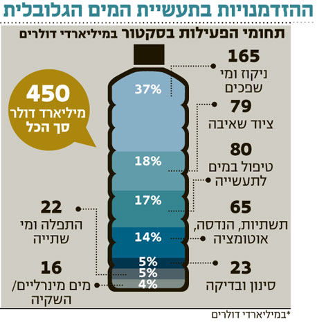 תעשיית המים הגלובלית מגלגלת כ־450 מיליארד דולר בשנה, וצומחת כיום בשיעור שנתי של 4%–6% - צמיחה של 8%–10% במדינות מתפתחות כמו סין והודו ו־2% בממוצע במדינות המפותחות. לצורך השוואה, על פי הערכת הבנק העולמי תצמח כלכלת העולם בשיעור של 3.2%–3.6% בכל אחת משלוש השנים הקרובות.