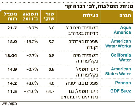 תעשיית המים, המגלגלת 450 מיליארד דולר בשנה, צפויה לצמוח בשלוש השנים הקרובות ב־10%. דברה קוי, שהוכתרה ע"י מגזין "פורבס" כאנליסטית המים הטובה ביותר ב־2010, ממליצה על קליפורניה ווטר ופנון הבריטית