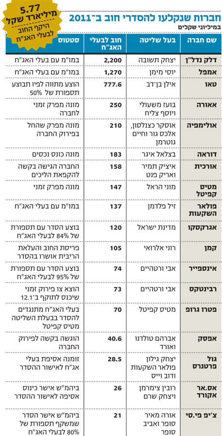 מבדיקת "כלכליסט" עולה כי אילן בן־דב, יצחק תשובה ויוסי מימן הם שלושת בעלי השליטה שמובילים את הסדרי החוב ב־2011 והיקף החוב שלהם לבעלי האג"ח מסתכם ב־4.25 מיליארד שקל - כ־72% מהיקף החוב של כלל החברות (5.77 מיליארד שקל).