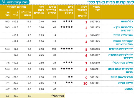 ב"תחתית" הדירוג, אפסילון 36 שיפרה כמה מקומות: מההמקום הלפני אחרון בתחילת השנה למקום ה־24. אגב, באנליסט מניות שירדה מהמקום העשירי בתחילת השנה למקום ה־17 השנה, לא השתנה כלל שכרו של מנהל הקרן. יתרה מכך, עכשיו כשדמי ההפצה של הקרנות המנייתיות עומדים לרדת מ־0.8% ל־0.4%, נראה שהתירוץ האחרון שעמד לקרנות הללו לגביית דמי הניהול הגבוהים (לעומת קרנות אג"ח למשל) אבד אף הוא.
