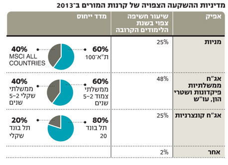הצצה במדיניות ההשקעה של קרן ההשתלמות של המורים והגננות מחזיקה ב־26.5% מהמניות לעומת ממוצע של 31% בקרנות הפרטיות. יתרה מכך, לפי המדיניות של ועדת ההשקעות, ההשקעה במניות מתבצעת בעיקר במדד ת"א־100 (60% לערך) וכ־40% נוספים במדד מניות חו"ל, החלטה שהתבררה כשגויה בדיעבד כשהשוק האמריקאי הניב תשואה עודפת. הקרנות הפרטיות, לעומת זאת, מקצות כ־10% מהחשיפה המנייתית להשקעה במניות יתר וכ־50%–70% מהחשיפה המנייתית מושקעים במניות בחו"ל.