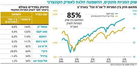 אולם לפי המצב כיום, כשהתשואות בארה"ב נמוכות ועומדות על כ־1.9%, שווי החברה הוא קצת מעל מיליארד דולר (20 מיליון לחלק ל־1.9%). כלומר, שווייה של חברה זהה עם רווח זהה יהיה גבוה בכ־110% בשל התשואות הנמוכות של האג"ח הממשלתיות. נציין שמדובר בדוגמה לצורך המחשבה בלבד. הנוסחה המימונית לגבי התשואה הנדרשת של בעלי המניות מעט שונה וממותנת יותר, אך הנקודה ברורה - לתשואות הנמוכות באג"ח האמריקאיות הארוכות השלכות מתמטיות על שווי המניות.