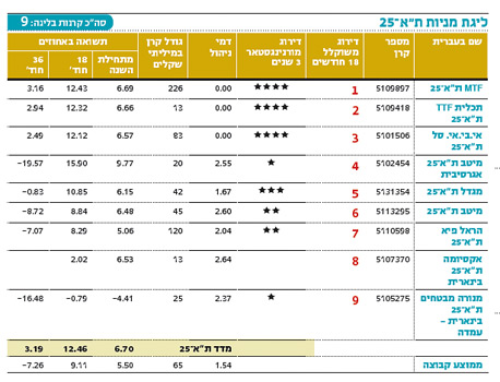 שלוש הקרנות המובילות בקטגוריה הן קרנות מחקות: MTF ת"א־25, תכלית TTF ת"א־25 ואי.בי.אי סל ת"א־25. אחריהן מגיעות הקרנות האקטיביות ובראשן מיטב ת"א־25 אגרסיבית, עם התשואות הגבוהות ביותר מתחילת השנה וב־18 החודשים האחרונים (9.77% ו־15.90% בהתאמה), אך נמוכות בשלוש שנים (19.57%–). את הדירוג סוגרות שתי הקרנות הבינאריות: אקסיומה ת"א־25 בינארית ומנורה מבטחים ת"א־25 בינארית - עמדה. לגבי הקרן האחרונה מסביר דרור גילאון, סמנכ"ל ההשקעות במנורה מבטחים קרנות נאמנות, שהמודל המתמטי שעליו שעונה הקרן לא ידע להתמודד עם הדשדוש הארוך ששרר במדד שהקשה על המודל לתזמן נכון את הכניסה והיציאה מהמדד.