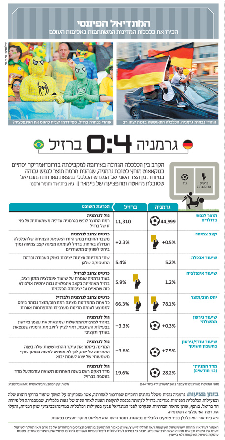 בזמן פציעות: גרמניה נהנית משלל נתונים חיוביים שפורסמו לאחרונה, אשר מצביעים על המשך שיפור בהיקף היצוא שלה ובפעילות הכלכלית הפנימית במדינה. ברזיל לעומתה נכנסה לתקופת האטה לאחר שנים של גאות כלכלית, שבמסגרתה חל פיחות חד בריאל. בנוסף, אותן מחאות חברתיות שנערכו לפני המונדיאל פגעו בפעילות הכלכלית במדינה ובביצועי שוק המניות, והעלו את רמת האינפלציה המקומית.
