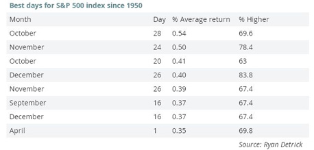 ריאן דטריק, בלוגר פיננסי והאסטרטג הראשי בקימבל צ'רטינג סלושיונס (Kimble Charting Solutions), מציין כי מבחינה היסטורית ה-28 באוקטובר הוא אחד הימים הטובים ביותר בכל הקשור לביצועים של המניות הנסחרות במדד S&P 500, לפחות ב-65 השנים האחרונות.