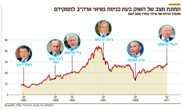 גם הנשיא הקודם ברק אובמה נשען על נקודת כניסה נוחה במיוחד, לפחות מבחינת מכפיל הרווח, שעמד בתחילת 2009 על 13.3. כניסה מאתגרת יחסית היתה לביל קלינטון: בזמן השבעתו לכהונה הראשונה, בינואר 1993, עמד מכפיל הרווח על כ־20. אף על פי כן, התנפחות בלתי רציונלית של בועת הטכנולוגיה הביאה את הבורסה לתשואה מדהימה של 209% בתקופתו.