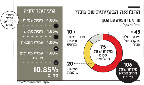 גם זה עוד לא הסוף. בנוסף, גינדי תשלם עמלת הקצאת אשראי בשיעור של 1% מסכום ההלוואה ועמלה בשיעור זהה גם למתווכים וליועצים. בשורה התחתונה, גינדי תקבל לידיה 64.4 מיליון שקל בלבד.