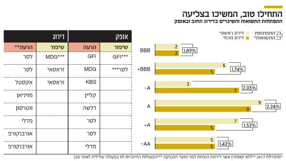 בחינה מעמיקה יותר של אופי דירוגי האשראי על פני השנים האחרונות מלמד על התבגרות העוסקים בתחום ועל ירידת האמון של חברות הדירוג במגייסות. החוב בקבוצת ה־-A זינק ב־16%, בעיקר בשל החברות לסר ואקסטל שהסיטו את נקודת הכובד בענף לכיוון נמוך יותר. מנגד, ביתר קבוצות הדירוג ירד שיעור החוב ביחס לחוב הכולל. בקבוצת -AA ירד היקף החוב בשיעור של 3%, בקבוצת +A ירד החוב ב־4%, בדירוג A — החוב ירד ב־7% ובדירוג +BBB החוב ירד ב־2%.