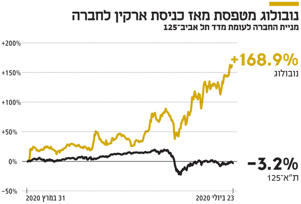ארקין ניצל מומנטום חיובי במניית נובולוג, שעלתה ב־108% ב־12 החודשים האחרונים אך תפסה תאוצה משמעותית מאז פרוץ משבר הקורונה. עיקר הקפיצה במחיר המניה החל ברבעון השני השנה, ומשיא הלחץ בבורסה המקומית במהלך המשבר (12.3.2020) ועד אתמול זינקה המניה ב־76%. נובולוג, שהוקמה ב־1966, עוסקת בהפצת תרופות עבור חברות בינלאומיות, במתן שירותי לוגיסטיקה בתחום הניסויים הקליניים ובהנגשה של שירותי בריאות למטופלים. בראש החברה, שמעסיקה 650 עובדים, עומד המנכ"ל עירן טאוס.