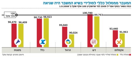 בדיקת ממוצע התשואות של חמש הקופות הגדולות במסלולים הסולידיים השונים מראה באופן חד־משמעי שמי שבחר להעביר את כספו בתחילת חודש נובמבר למסלול השקלי ספג את ההפסד הגדול ביותר בתום התקופה הנבדקת. כלומר מי שבקופתו היו 100 אלף שקל בתחילת ספטמבר 2008 במסלול כללי והחליט להעביר את הכסף למסלול שקלי בתחילת נובמבר 2008, הפסיד בסוף אפריל 2009 10.34% בממוצע מהחיסכון שלו. לעומת זאת במסלול האג"חי נרשם ההפסד הקטן ביותר באופן יחסי לנקודת הפתיחה - 1.79%. בהפרש קטן, עם הפסד של 1.95% עומד המסלול צמוד המדד.