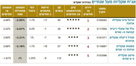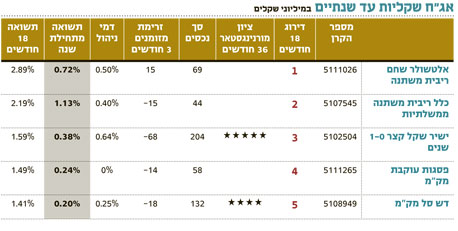 עבור משקיעי הקרנות השקליות נציין כי אף לא קרן אחת מבין הקרנות הקצרות הצליחה להכות את מדד היחס בטווח של שלוש שנים. 23 הקרנות בקטגוריה, המנהלות 3.9 מיליארד שקל, הניבו בממוצע 6.1% בשלוש שנים לעומת 8.3% של מדד השקליות 0–2 שנים. לעומת זאת, הקרנות השקליות במח"מ של יותר משנתיים הניבו 18% בשלוש שנים, והיכו את מדד היחס שעלה ב־15.3%.