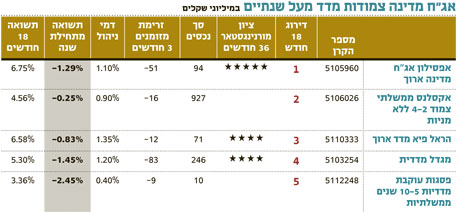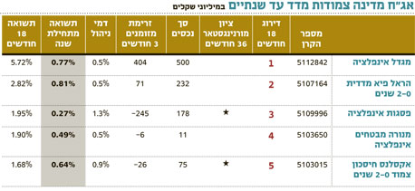 מי שמובילה את הקטגוריה היא קרן מגדל אינפלציה, שהניבה בשנה וחצי את התשואה הגבוהה ביותר בקבוצה, 5.72%, בעוד שמדד היחס של אג"ח ממשלתיות צמודות עד שנתיים עלה ב־2.06% בלבד.
