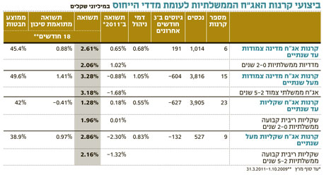 קטגוריית קרנות האג"ח הממשלתיות הצמודות במח"מ קצר גייסה ברבעון הראשון של 2011 כ־191 מיליון שקל. לנתון זה תרמה בעיקר קרן מגדל אינפלציה שגייסה 404 מיליון שקל לבדה. מנגד, נפדו 604 מיליון שקל בשלושה חודשים מקטגוריית האג"ח הצמודות הארוכות, וכן 627 מיליון שקל מהקרנות השקליות הקצרות, ו־132 מיליון שקל מהקרנות השקליות הארוכות.
