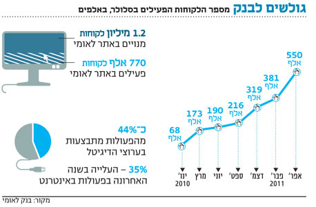 ברוך לדרמן, ראש החטיבה הבנקאית בלאומי, מרוצה מקצב המהיר שבו משקי הבית מאמצים את הטכנולוגיה: "כ־44% מהפעולות מתבצעות בדיגיטל, ומתחילת 2010 גדלה הפעילות בסלולר פי שמונה". הוא הרבה פחות אופטימי בנוגע לייעוץ הפנסיוני