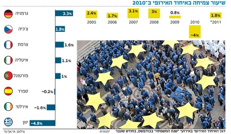לאמריקאים, המתלוננים על הקצב האטי של התאוששות הכלכלה שלהם, מוטב להתמקד בצד החיובי: באירופה המצב חמור יותר. על פי הערכות קרן המטבע הבינלאומית, ארה"ב צפויה לצמוח השנה ב־3%, ואילו גוש היורו יצמח בשיעור הנמוך במחצית. עניין מדהים יותר הוא הפערים העצומים בתוך גוש היורו עצמו: בעוד שהצמיחה הכלכלית של גרמניה עומדת כיום על 6% בשנה, הכלכלה היוונית התכווצה ברבעון הרביעי של 2010 בשיעור של 6%.