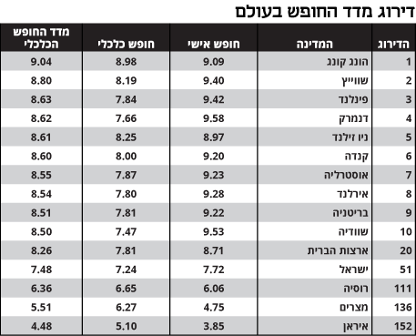 ישראל דורגה במקום ה-51 הכללי, אותו היא חולקת עם סורינם שבאמריקה הדרומית, ירידה לעומת המקום ה-48 בו דורגה בשנה שעברה. ישראל זכתה לניקוד כולל של 7.48, בעוד שבמדד החירות האישית קיבלה 7.72 נקודות ובמדד החופש הכלכלי 7.24 נקודות. ארה"ב דורגה במקום ה-20, מתחת למאוריציוס, ממדינות אפריקה.