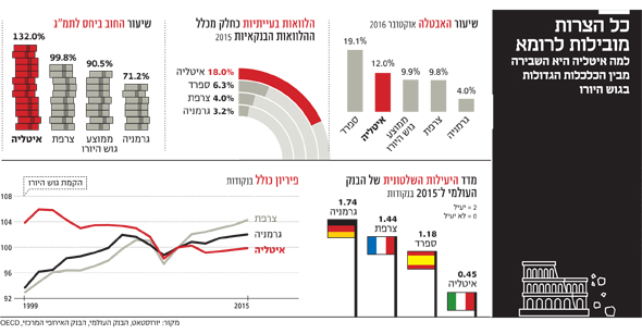 רנצי (41), צעיר ראשי הממשלה של איטליה, שהבטיח לייצב את המערכת הפוליטית ולהתניע את הכלכלה, השיג עתה, ככל הנראה, את ההיפך המוחלט. אתמול התעוררו אזרחי איטליה לסכנה מרחפת של משבר בנקאות מחריף ולקולותיהם הרושפים של פוליטיקאים אנטי־ממסדיים המאיימים לנתק את ארצם מגוש היורו דרך משאל עם. עיקר הדאגה מתנקז כעת למגזר הבנקאות האיטלקי, אשר שיעור החובות הלא מסופקים שלו הוא הגבוה בגוש היורו. בנק מונטה די פסקי, הבנק הפעיל העתיק בעולם, נמצא השבוע בעיצומו של תהליך גיוס הון בהיקף של 5 מיליארד יורו, וחובותיו הרעילים עומדים על 27.7 מיליארד יורו.