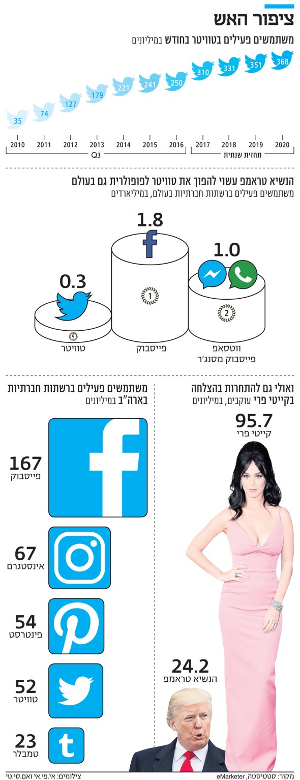 מניית טוויטר איבדה שליש משווייה מאז הונפקה החברה בנובמבר 2013, זאת לאחר שהמשקיעים חדלו להאמין כי תגיע אי פעם לממדים של פייסבוק. לשם השוואה, לטוויטר יש 313 מיליון משתמשים חודשיים פעילים, ואילו לפייסבוק הצטרפו 269 מיליון משתמשים חדשים רק בשנה שעברה, ומספר כלל משתמשיה מסתכם