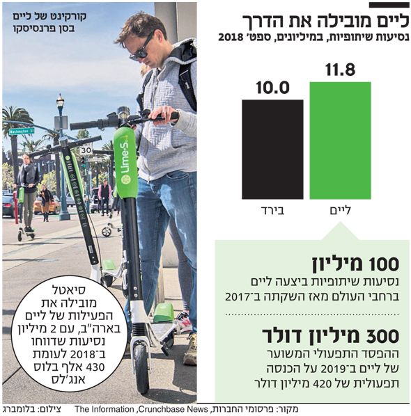 בשוק הקורקינטים הצעיר, ליים, שנוסדה בינואר 2017, נחשבת לאחת הוותיקות. החברה החלה את דרכה כשירות הפעלת אופניים שיתופיים, אך שנה מאוחר יותר השכילה לזהות את טרנד הקורקינטים החשמליים, שיצא לדרך בהובלת בירד. היא מיהרה לבצע פיבוט מוצלח והפכה לשחקנית מובילה, לצד ג'אמפ של אובר, ובירד עצמה. זאת, כמו יריבותיה, תוך הסתמכות על אסטרטגיה של גיוסים משמעותיים לפי שווי מרשים ומינוף הסכום לטובת כניסה מהירה לשווקים חדשים, כדי לזכות בראשוניות. אסטרטגיה זו לא היתה המצאה של חברות הקורקינטים. אובר, אם לא המייסדת של השיטה, היא זו שביצעה אותה באופן המובהק ביותר. מאז הקמתה התבססה אובר על גיוסים של מאות מיליוני דולרים ובהמשך מיליארדי דולרים כדי להתרחב במהירות אדירה, בלי לטרוח לבסס רווחיות או אפילו רווחיות תפעולית.