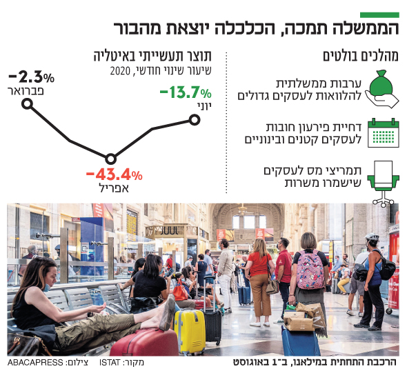 הכלכלה השלישית בגודלה באירופה, שהיתה הראשונה לספוג פגיעה קשה מהנגיף, מתאוששת בקצב מהיר יותר מצרפת וספרד. אנליסטים מייחסים את הנתונים החיוביים למהלכי הסיוע של ממשלת איטליה שבזכותם נשמרו משרות וייצור